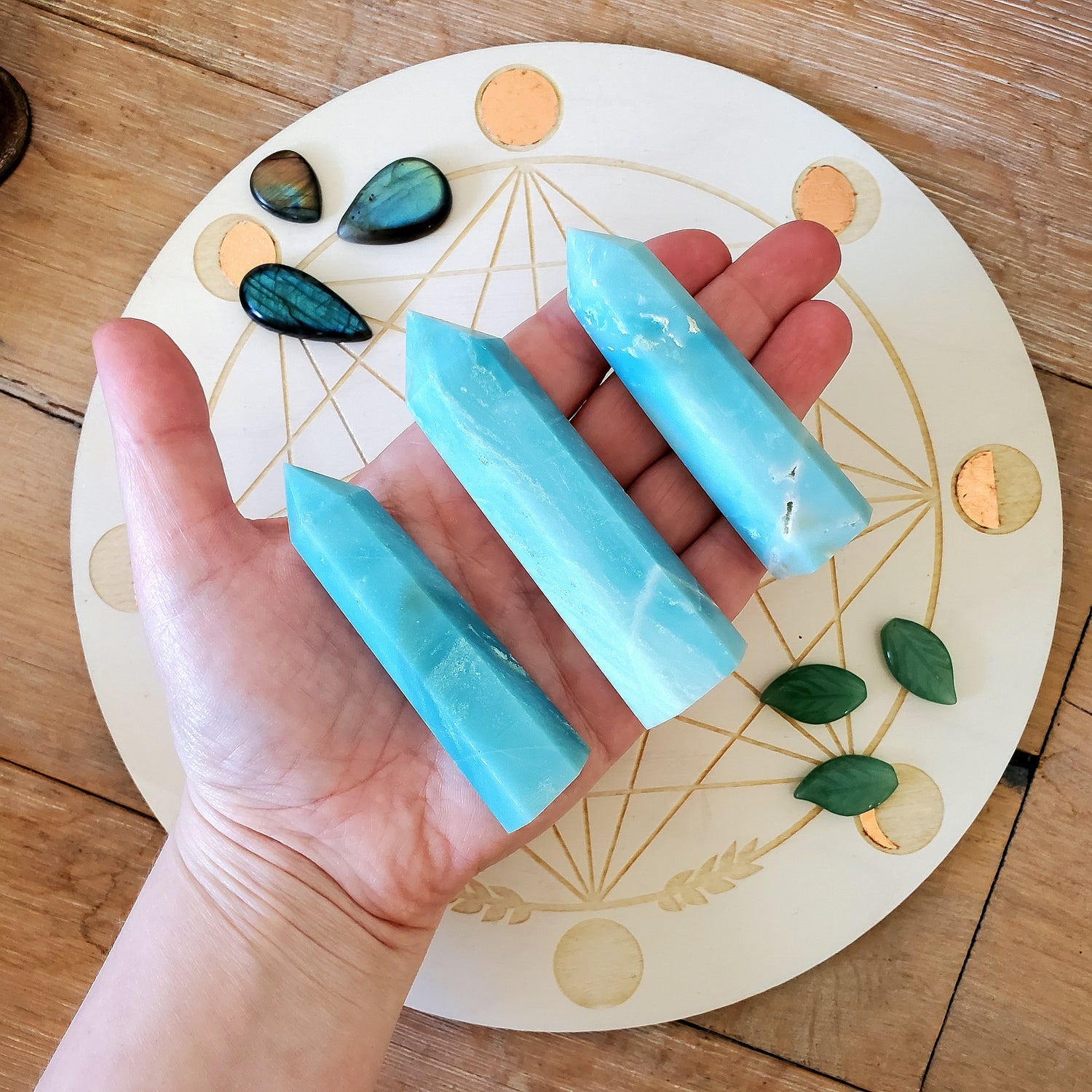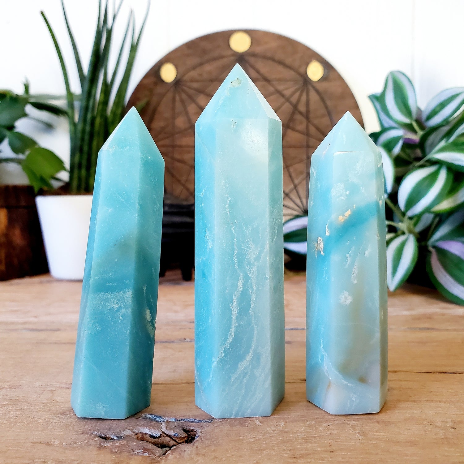 The points are carved from a microcrystalline variety of Amazonite, resulting in a creamy pale turquoise blue. Amazonite is like a cool breeze, balancing the yin and yang energies within you. By granting you a wider perspective, it can ease emotional turbulence and dispel anxious thoughts.