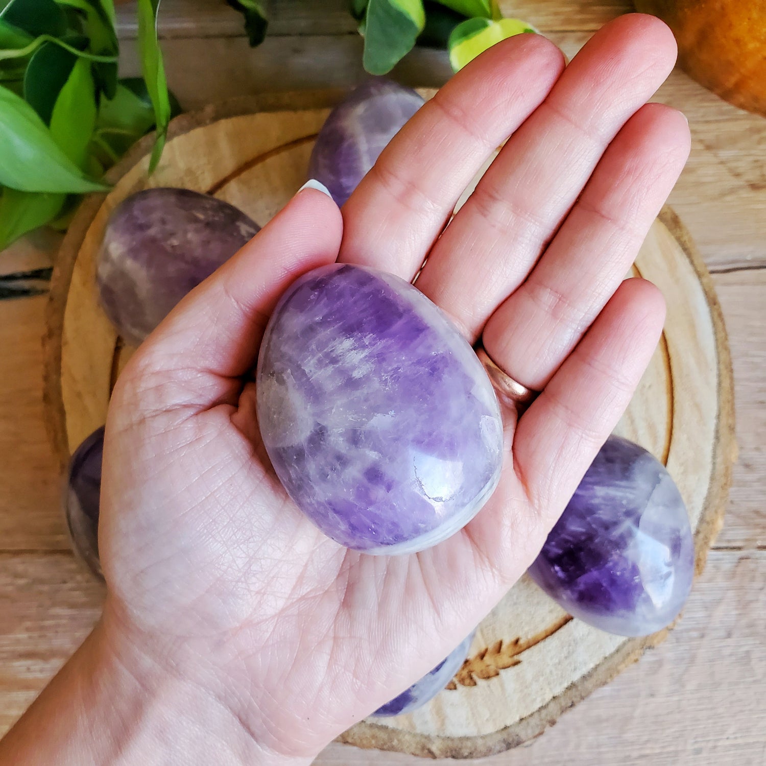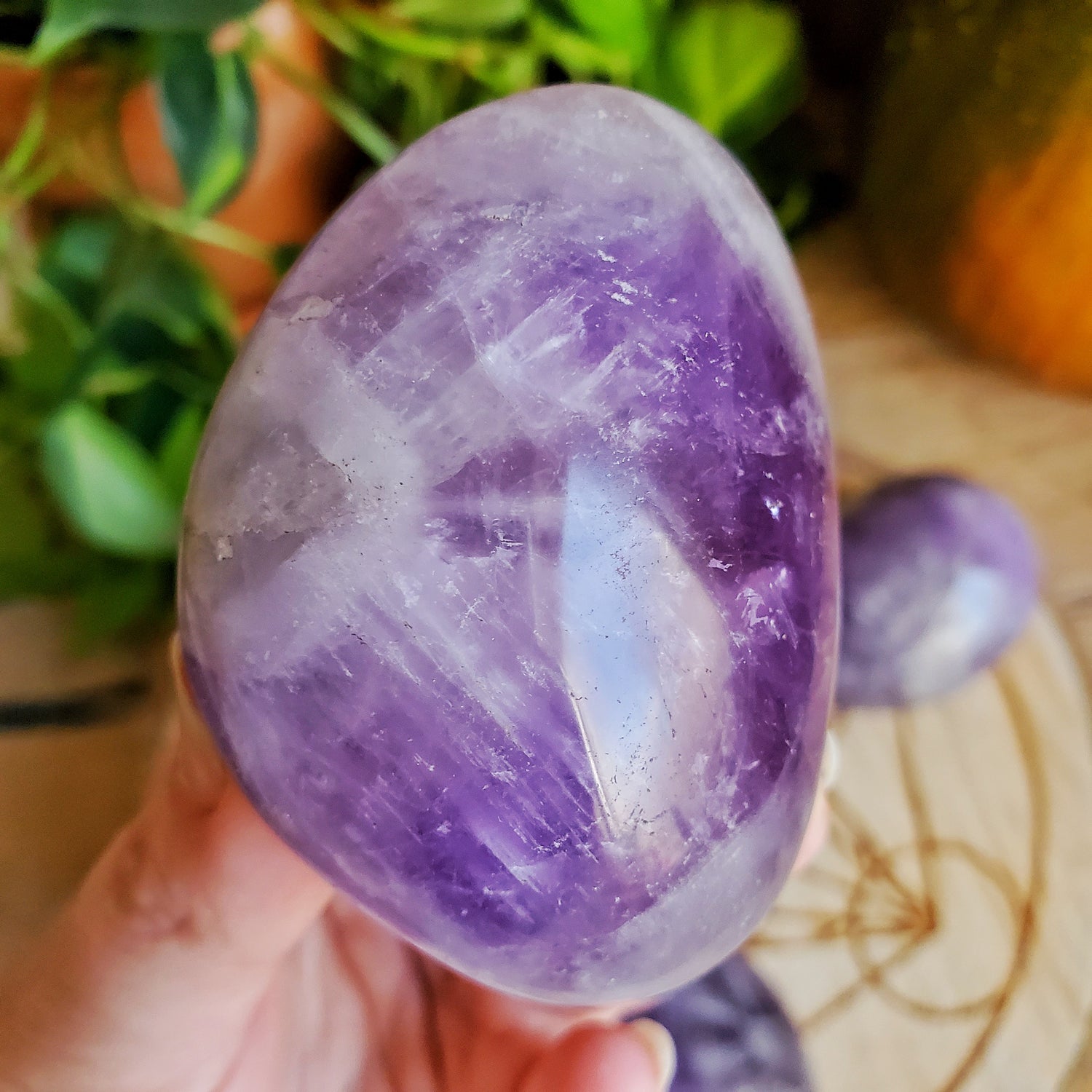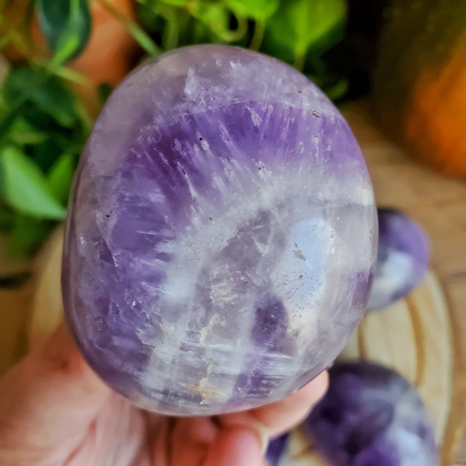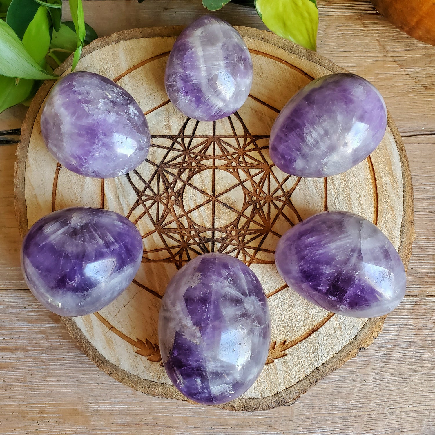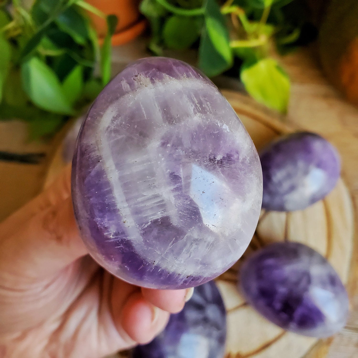 These lovely pastel amethyst palmstones feature chevron stripes of smoky quartz, amethyst, and clear quartz.