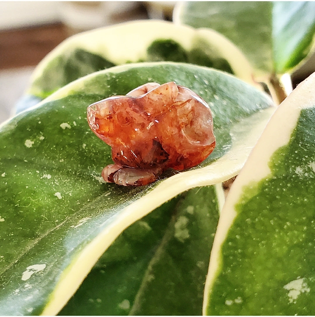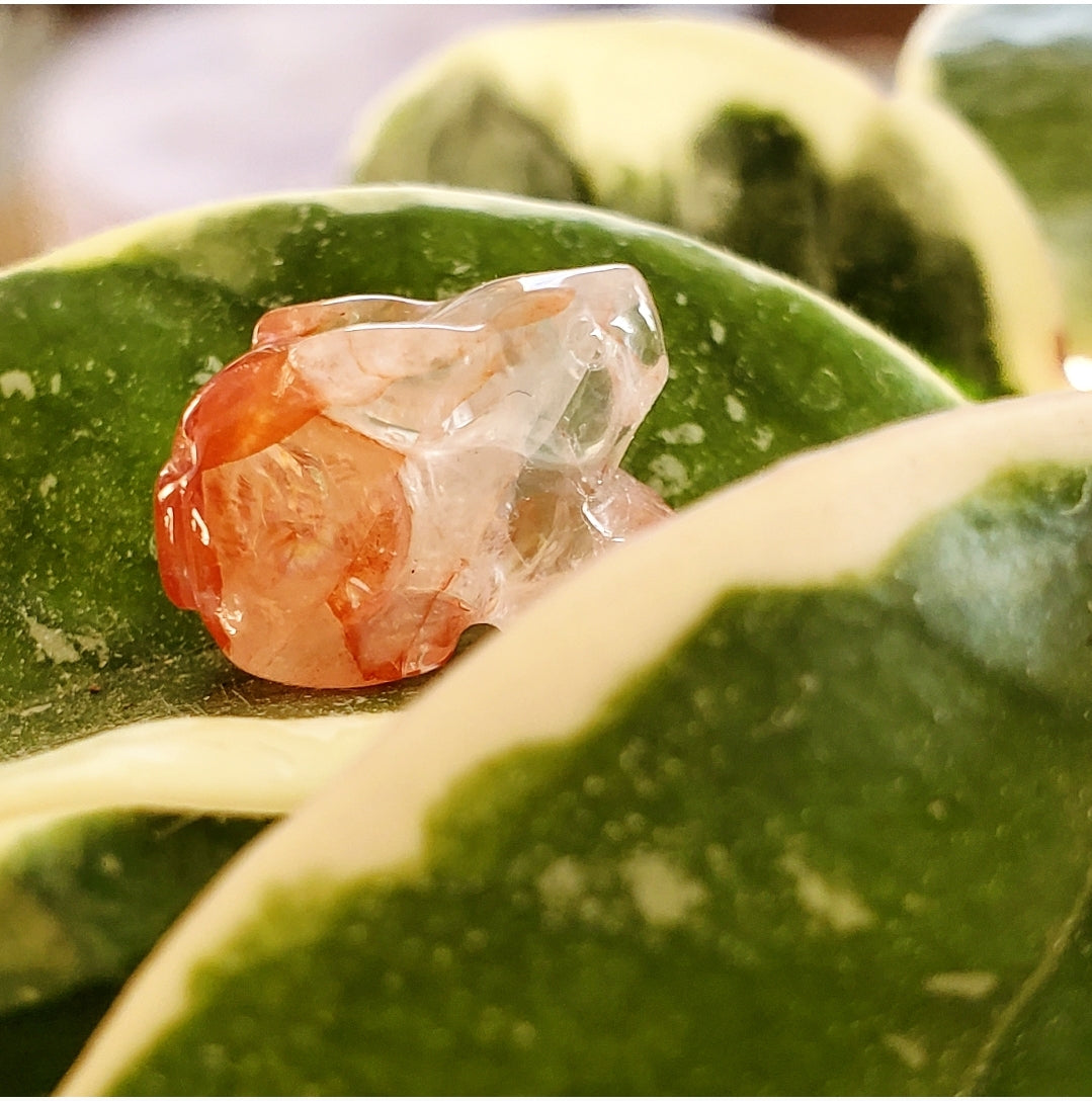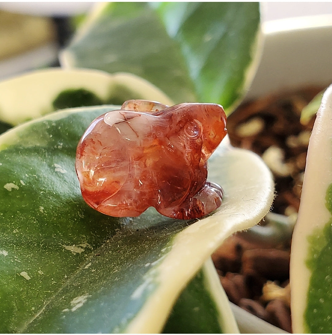 Rabbits represent prosperity, abundance, good luck and fertility. These gemmy fire and ice quartz bunnies feature water clear quartz with deep red hematite layers.
