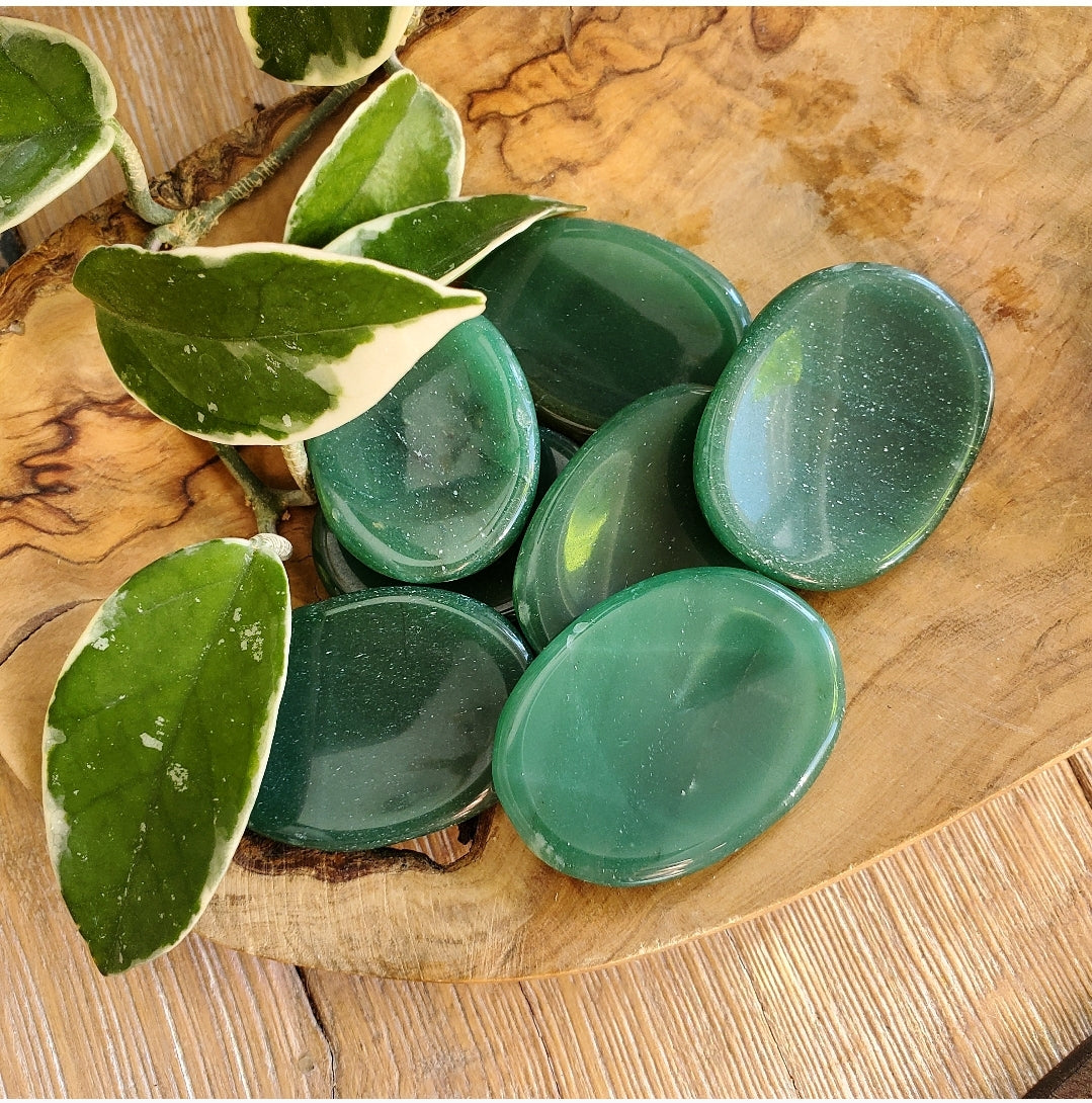 Green Aventurine is a comforter and heart healer, used to clear and activate the Heart Chakra for general well-being and emotional calm. It is also a powerful protector of the Heart Chakra, providing a shield to block negative entry. Deep Green polished Aventurine with divot for meditation
