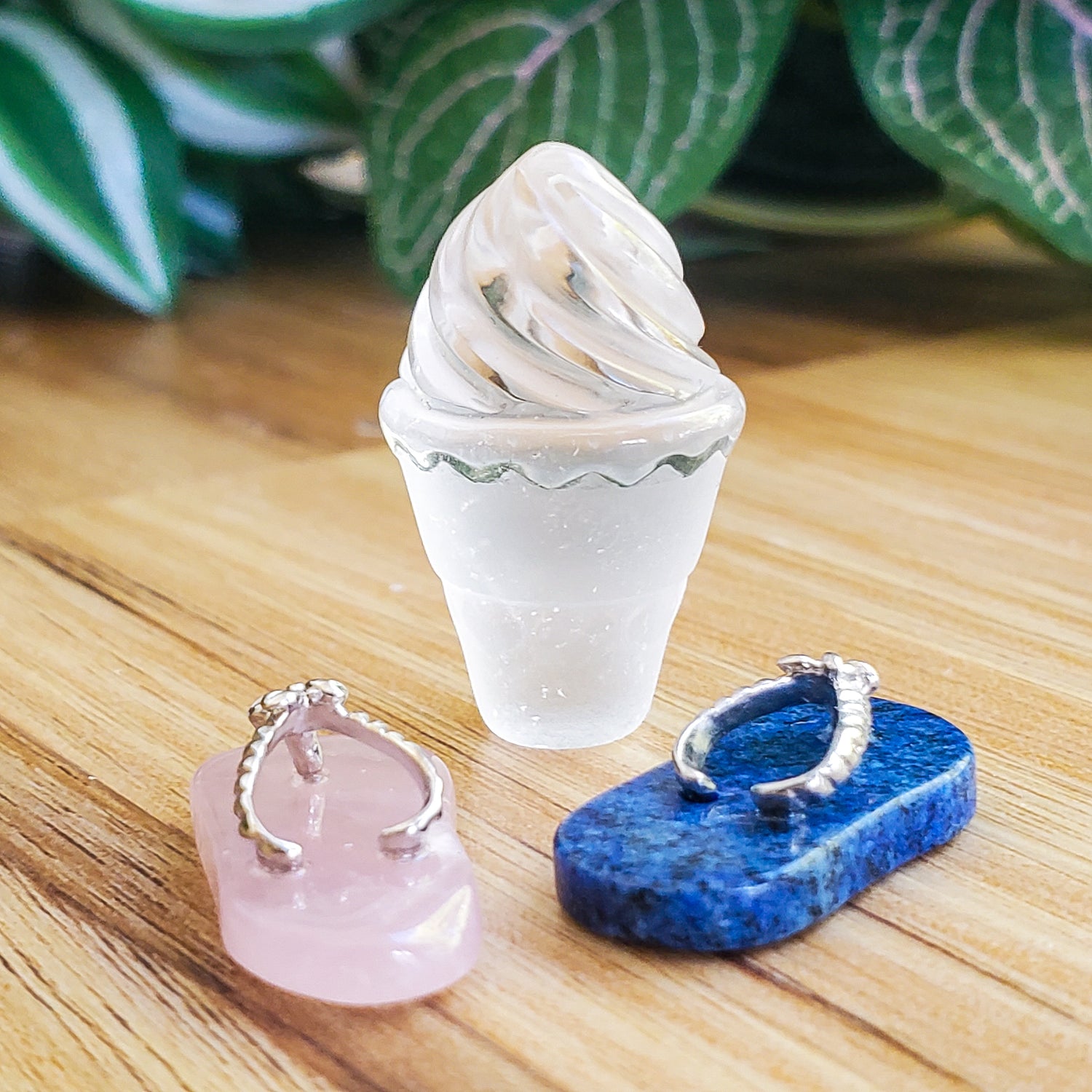 Extra clear quality carved Quartz Icecream Cone. The cones feature glossy clear icecream on a matte finished cone/base. each piece is 28 mm in height.