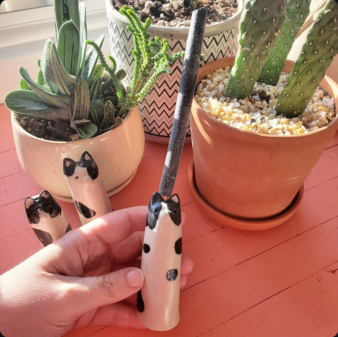 During one of our visits to Thailand, we had the pleasure of meeting a talented sculptor named Sot. We were so impressed by his work that we brought home several of his unique pieces during our most recent trip. Every piece is hand-sculpted by the artist and his wife Nui, who pour their hearts into their craft. These cute kitten incense holders, which I just had to adopt, are perfect for burning your favourite scent or displaying a small sprig of baby's breath or a single bloom.