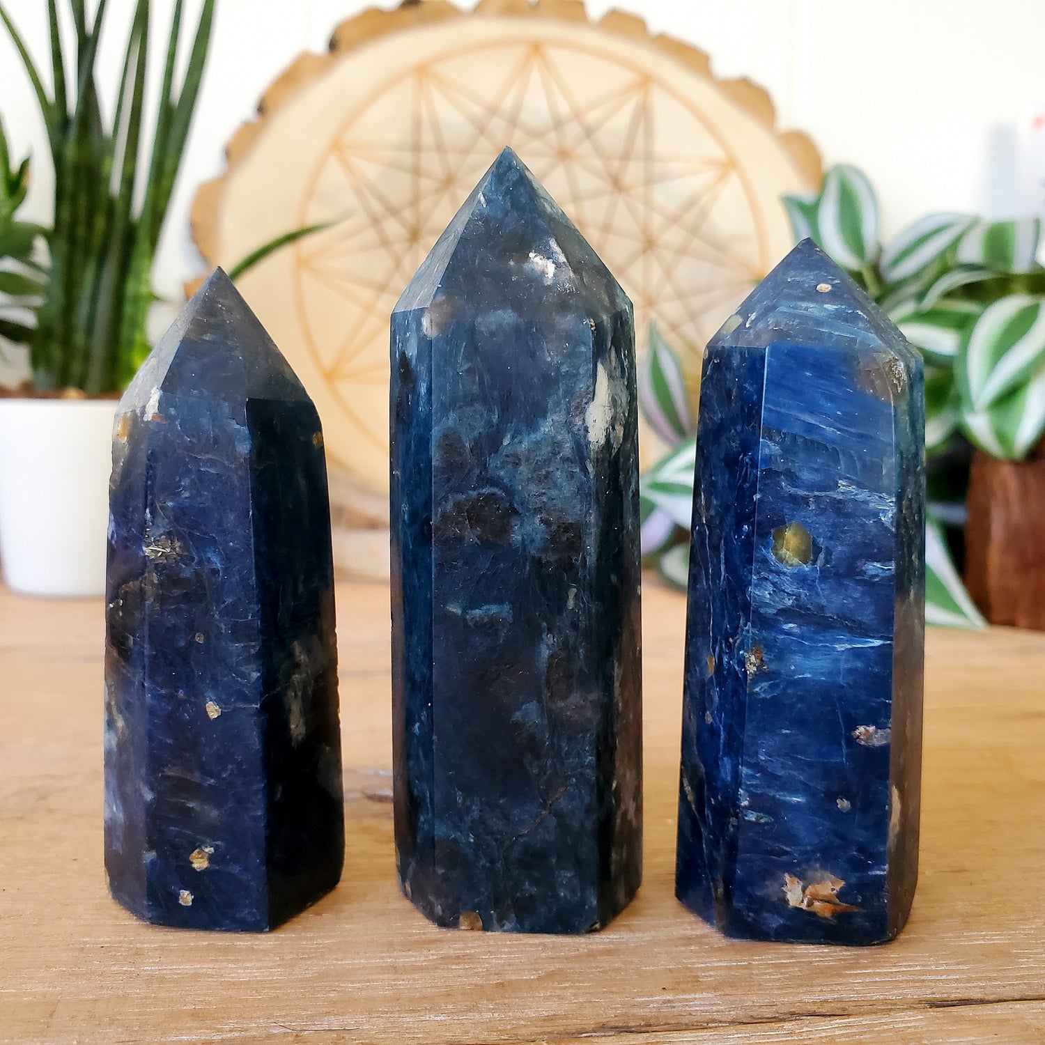 Unique deep blue kyanite point. Kyanite is rarely polished due to its low density, making these truly extraordinary. The soothing energy of blue kyanite is particularly beneficial for those struggling with communication. Its calming properties can boost self-confidence, providing comfort for those with public speaking or performing anxiety.