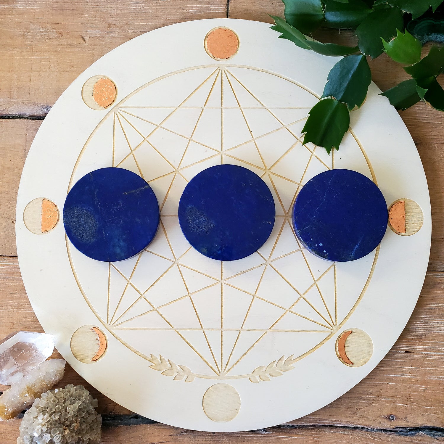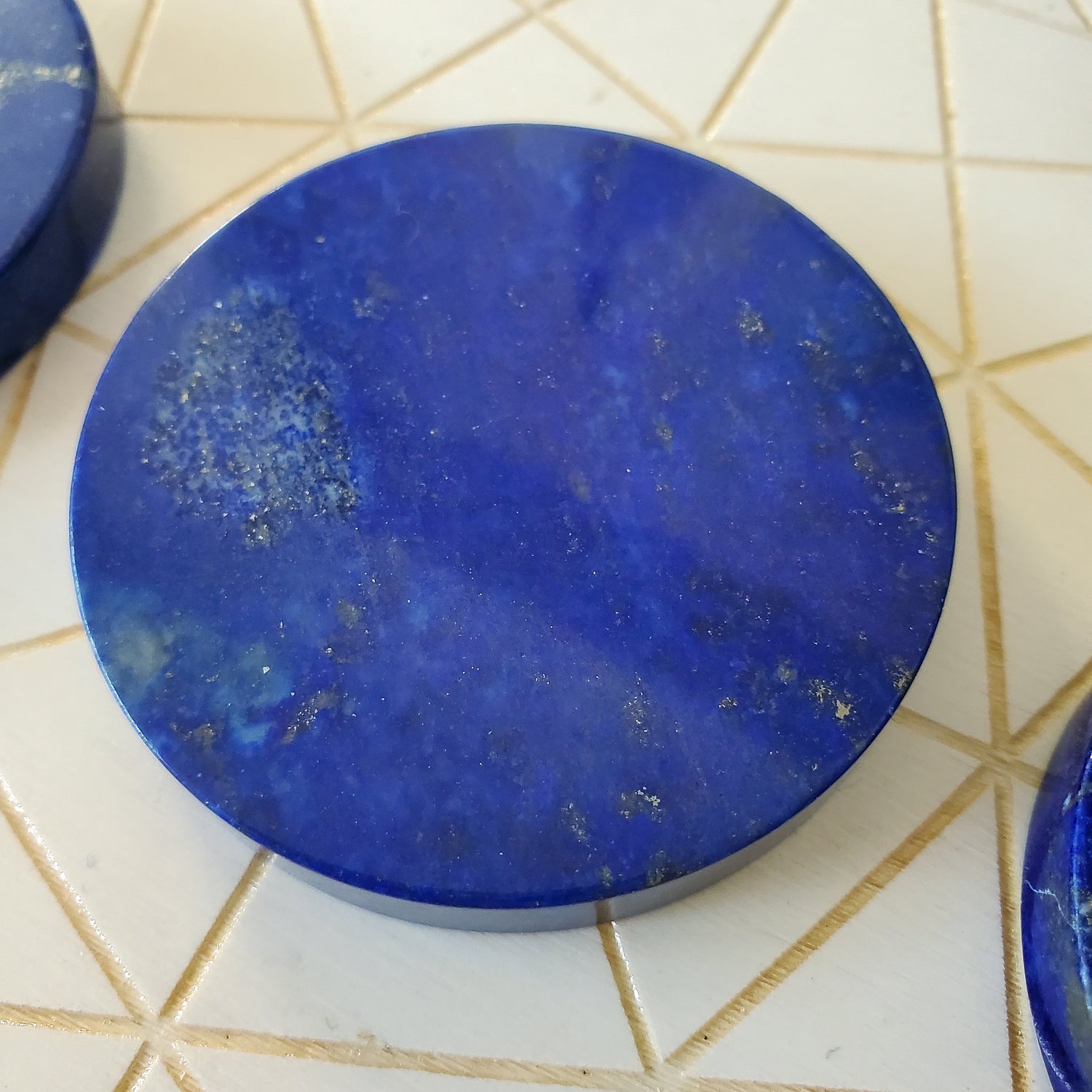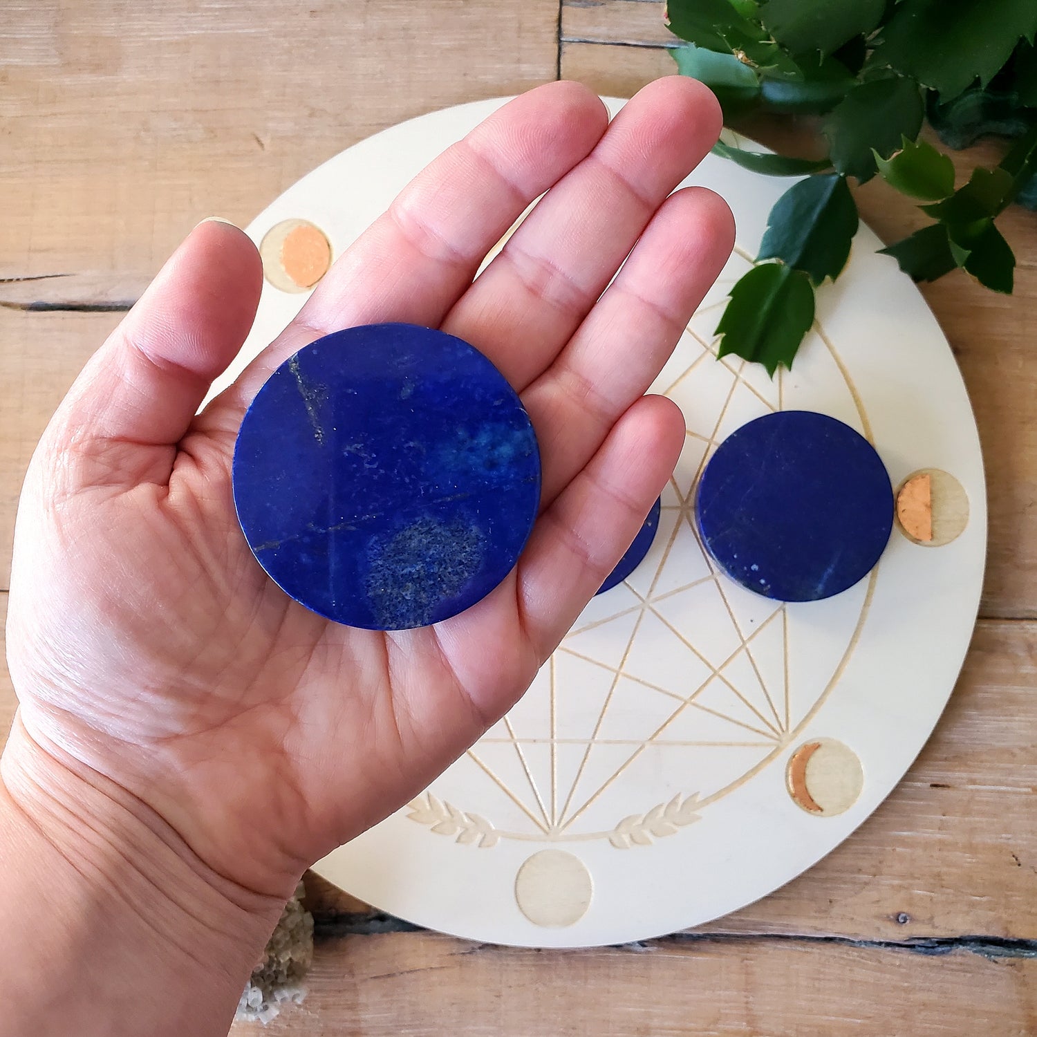 These high quality Lapis Lazuli disks are an incredible deep dark blue and encourages self awareness, clarity, and confidence. Helpful in creative endeavors where you wish to let your inner light shine. A stone of true friendship.