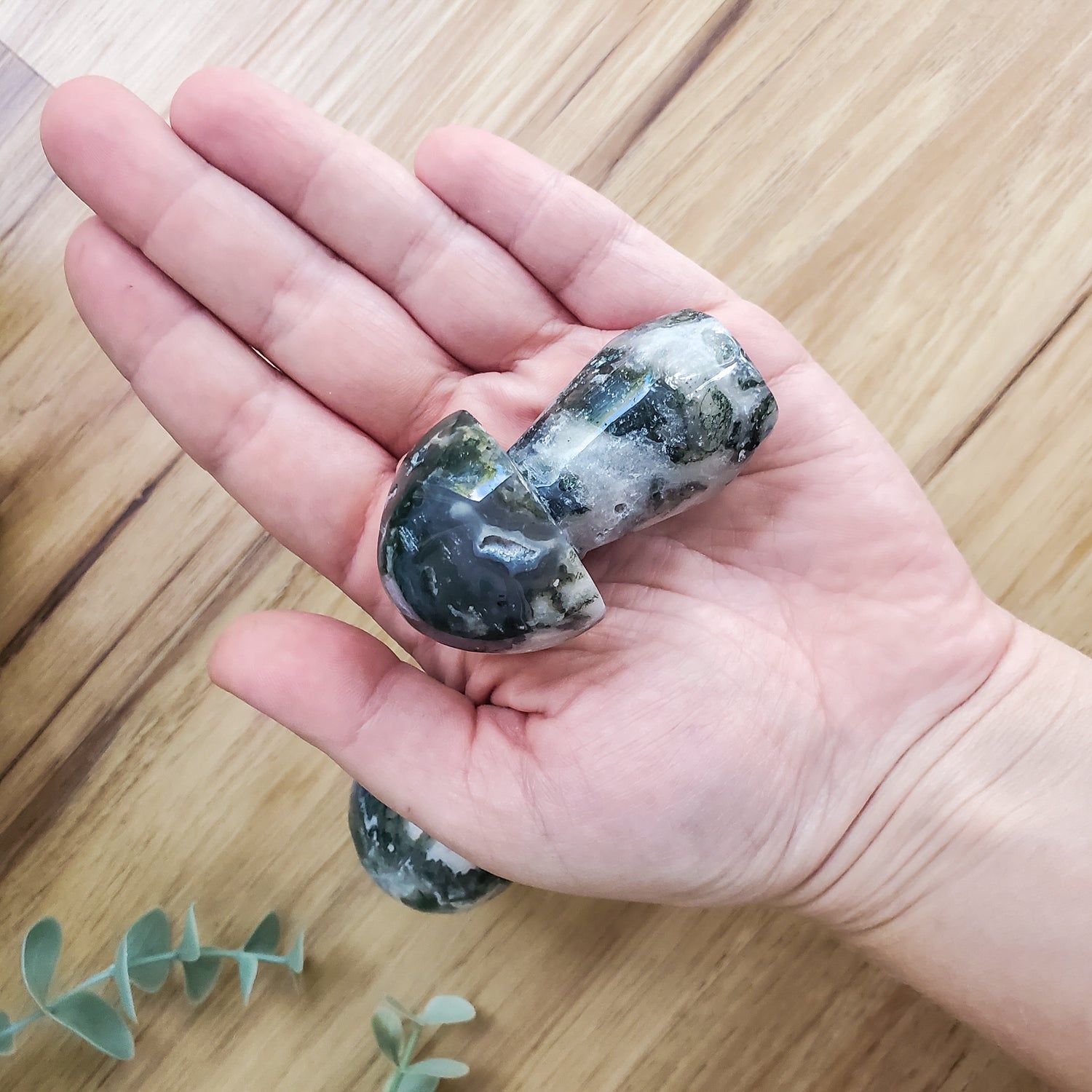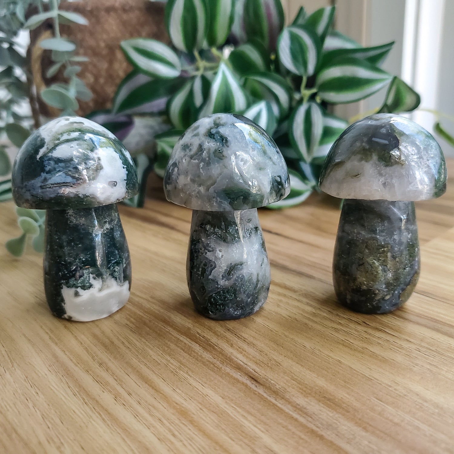 Mossy Agate mushrooms each featuring an enchanting blend of moss agate with clear quartz.