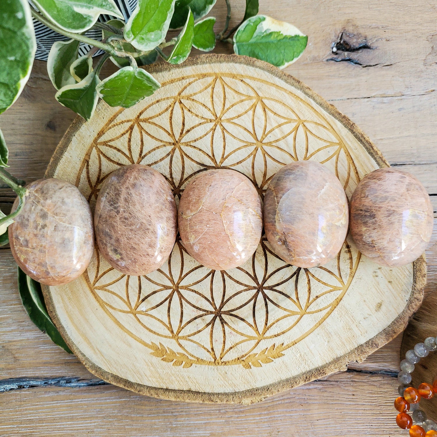Shimmering peach moonstone palmstones. Peach Moonstone is an extremely nurturing stone which gives off a comforting, almost mothering energy.