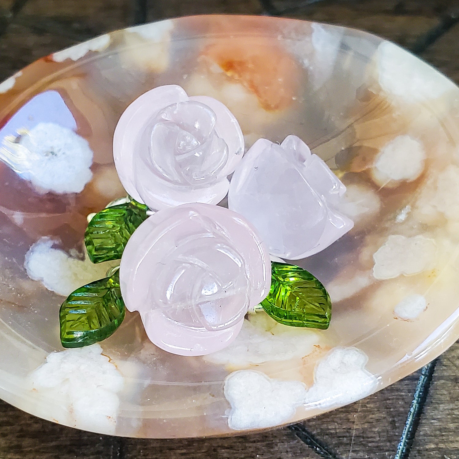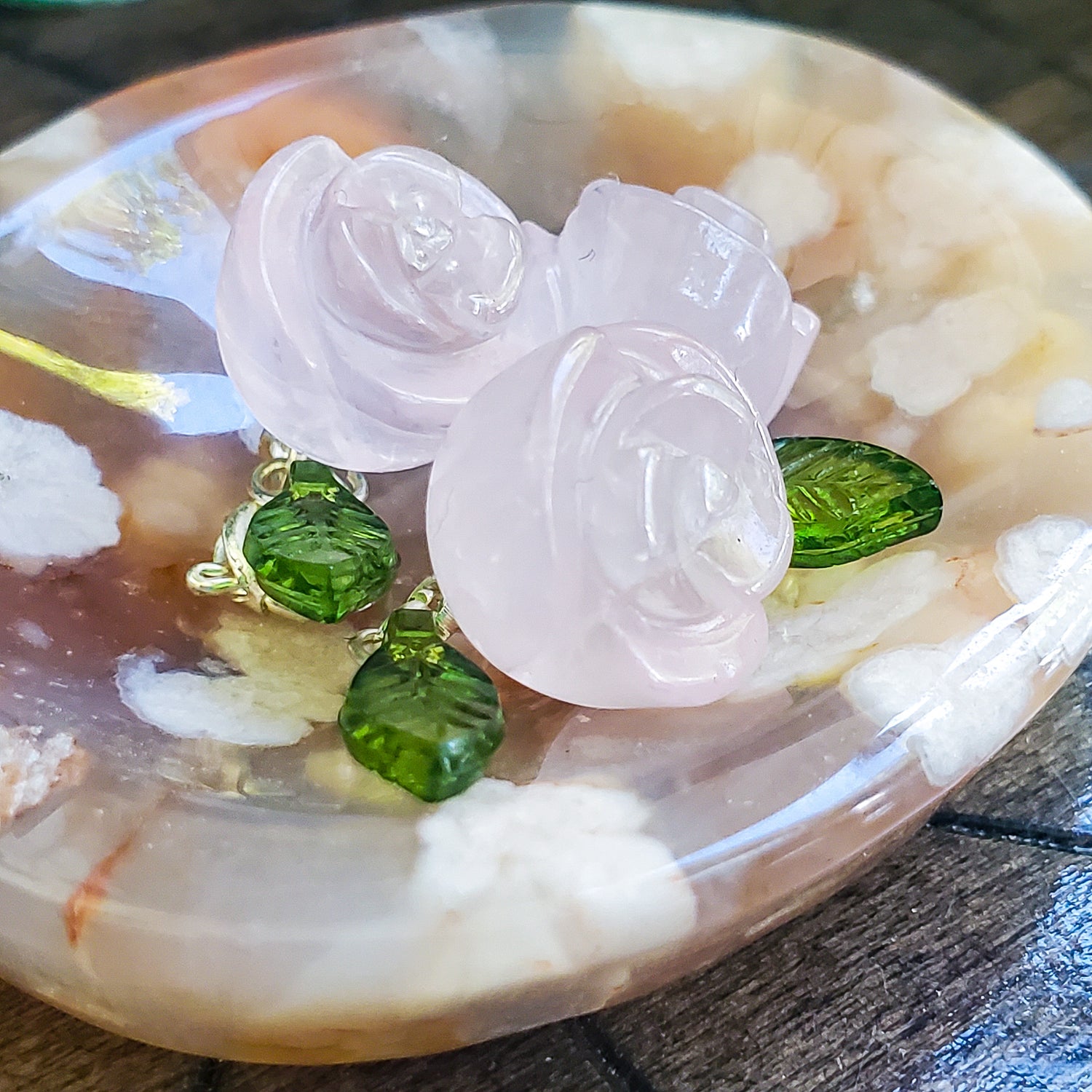 Beautiful rose carved from rose quartz with green leaf and silver clasp. 10 mm in size.