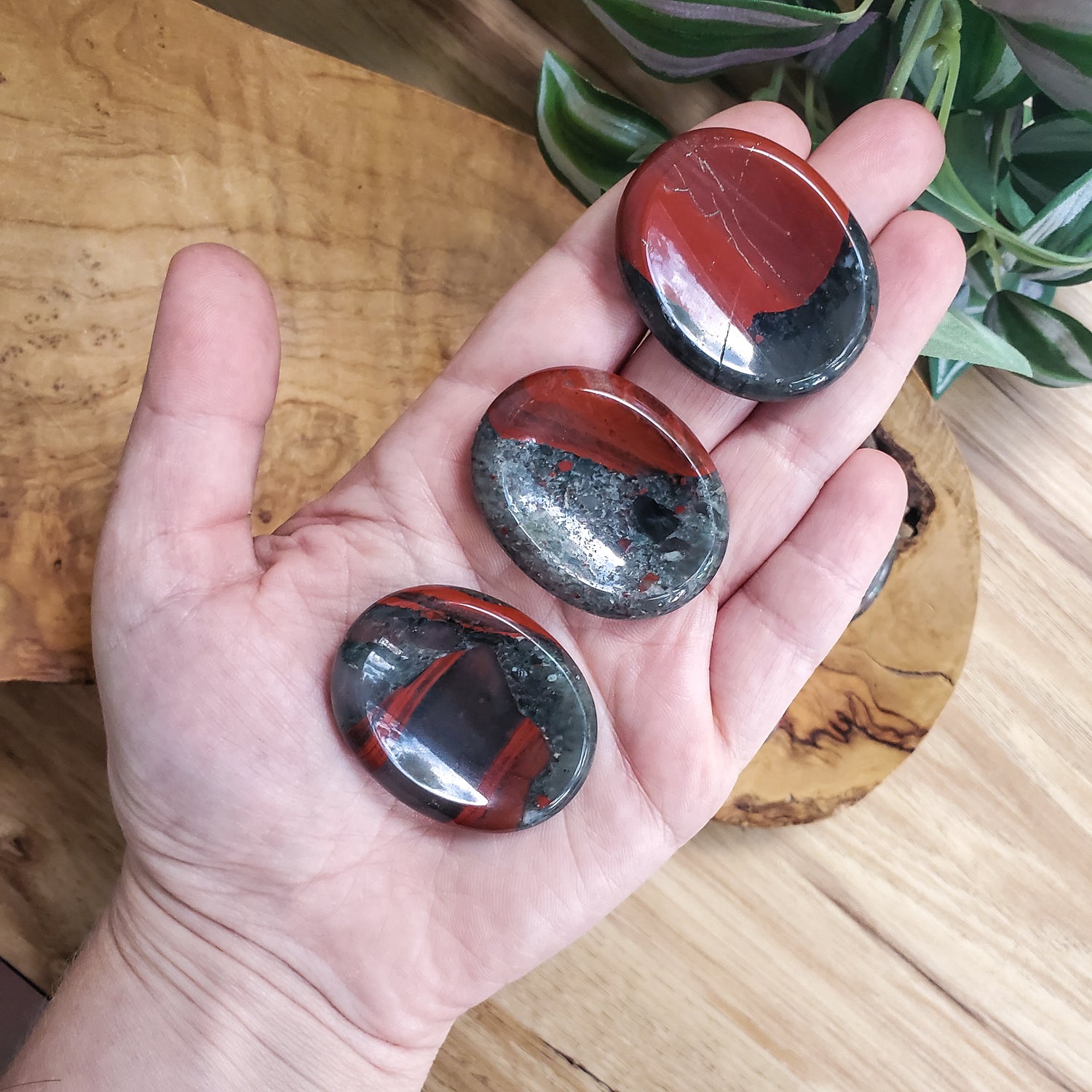South African Bloodstone, also called Seftonite, these palm stones are a natural mixture of deep-green chalcedony, quartz, red jasper, some flecked pyrite and more