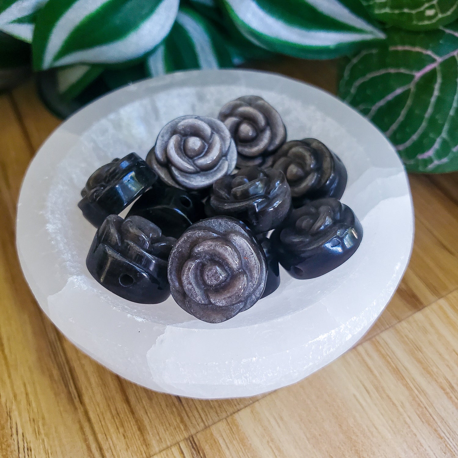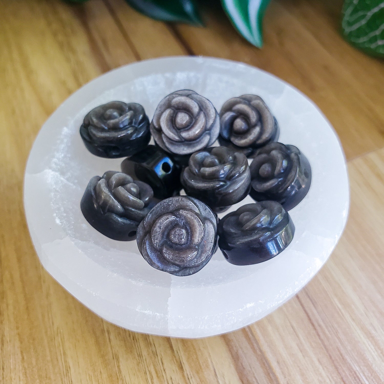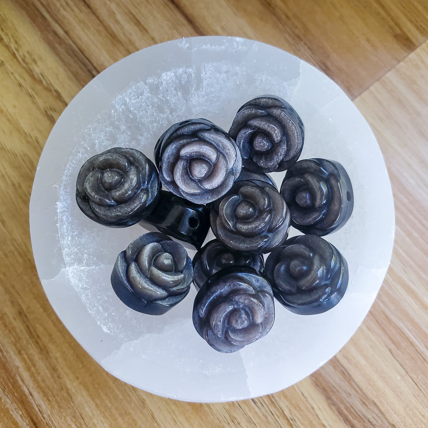 Lovely small black with silver sheen obsidian roses. Can be used as beads for jewelry.