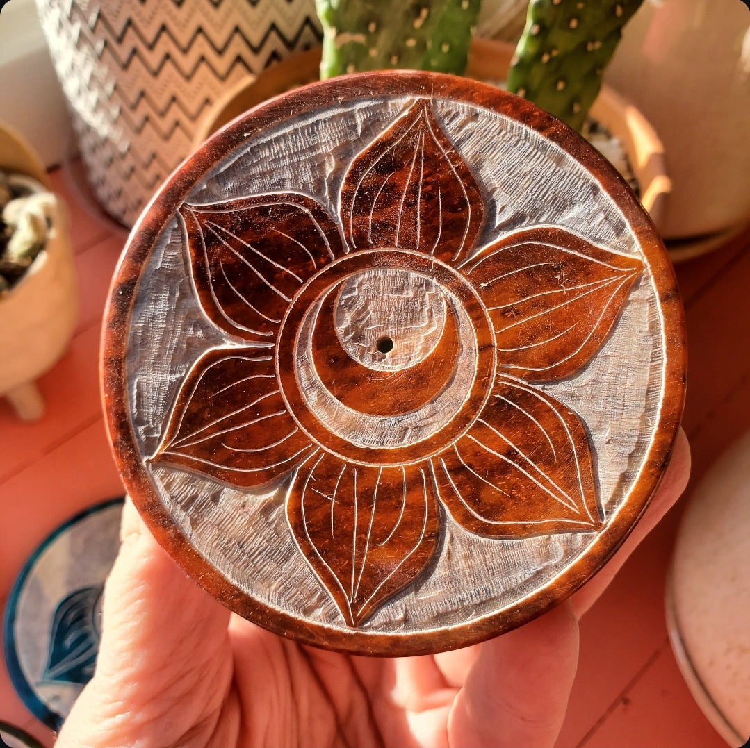Beautiful handcarved soapstone incense burners to help burn your stick incense safely.