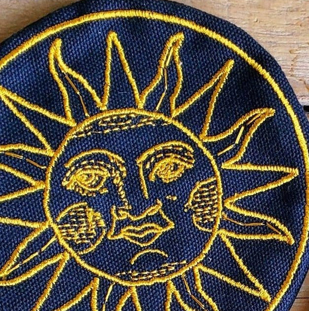 The beautiful hand sewn pouches are dyed a deep indigo blue, and embroidered with a victorian era inspired sun in goldenrod yellow.