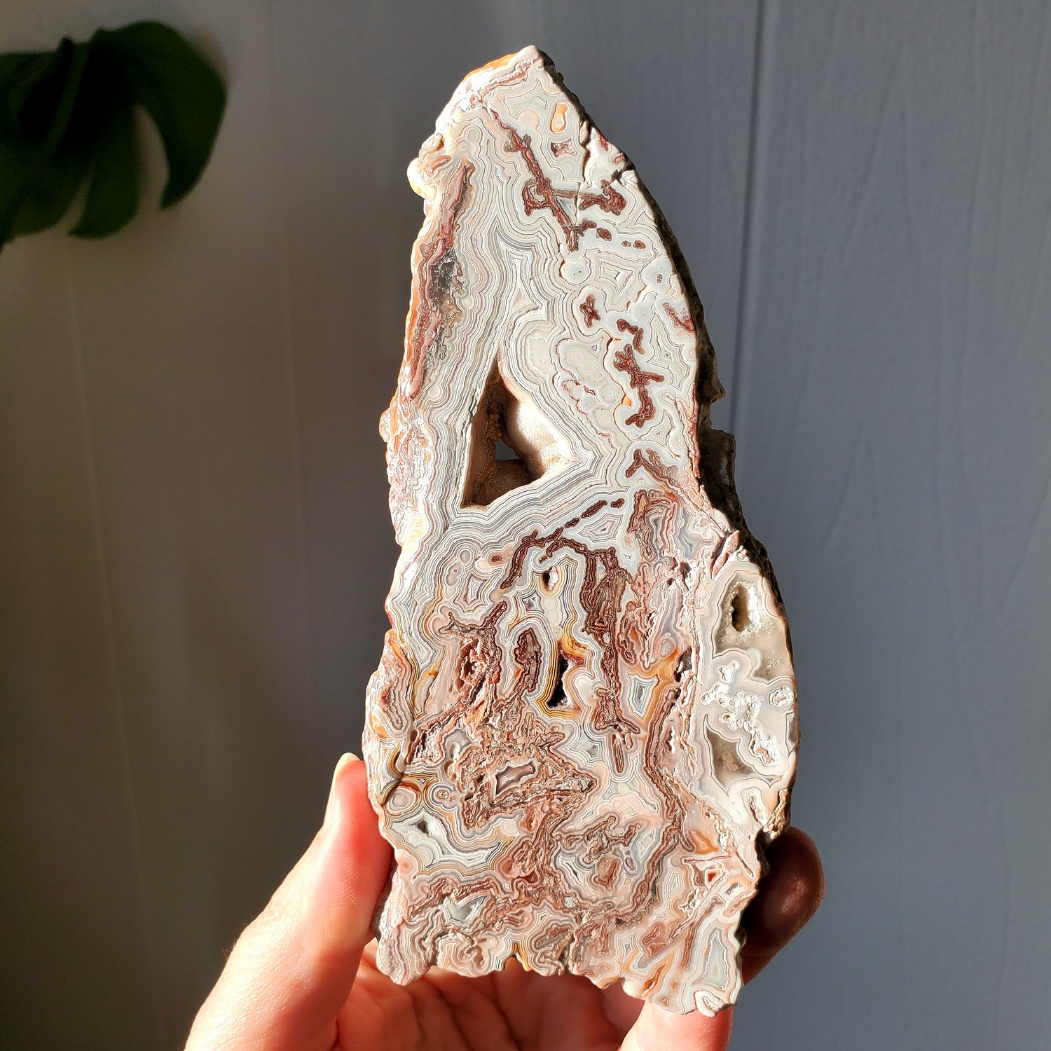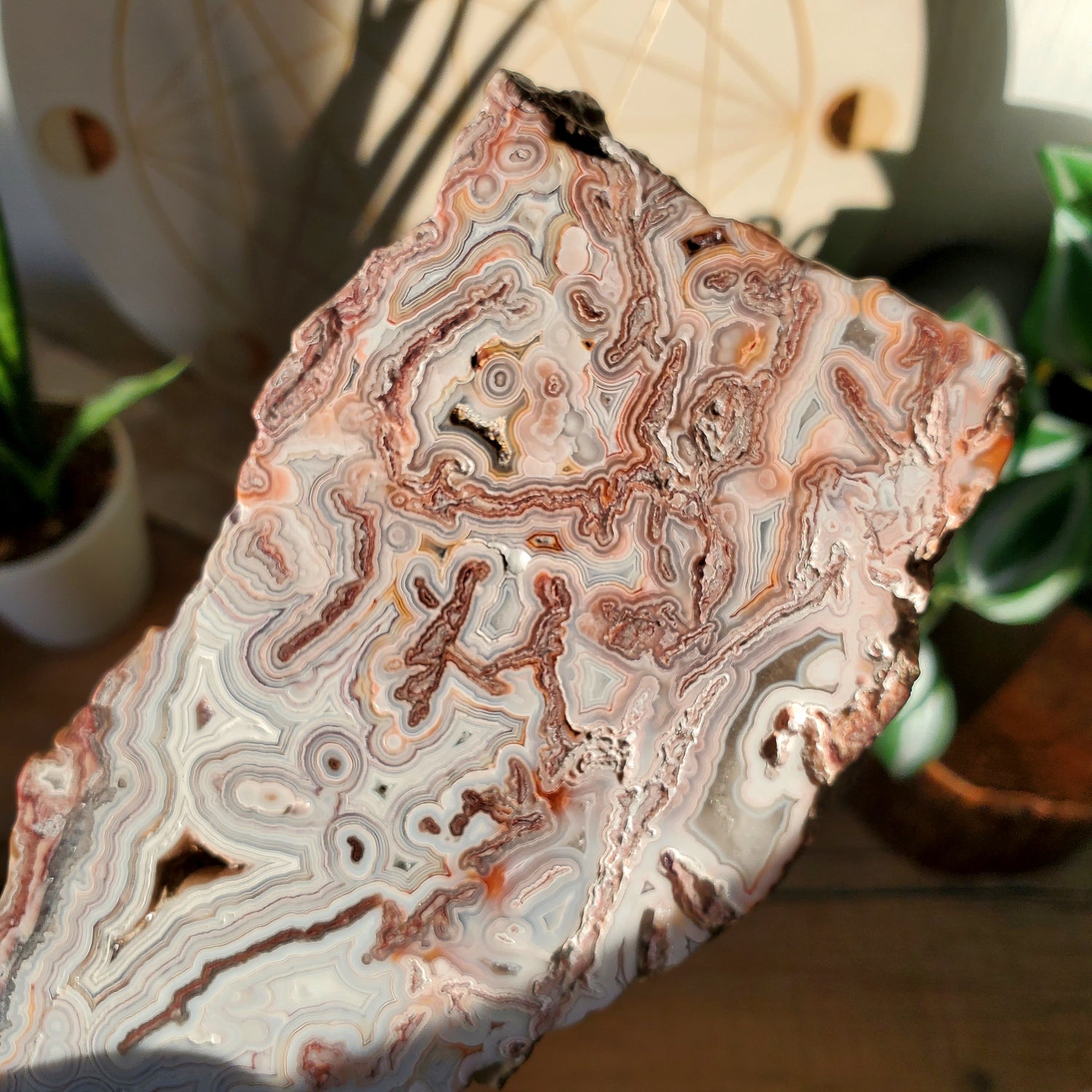 This White Lace Agate Slab, imported from Mexico, is polished on both sides and boasts stunning bands of grey and pink in a unique, eye-catching crazy-lace pattern.